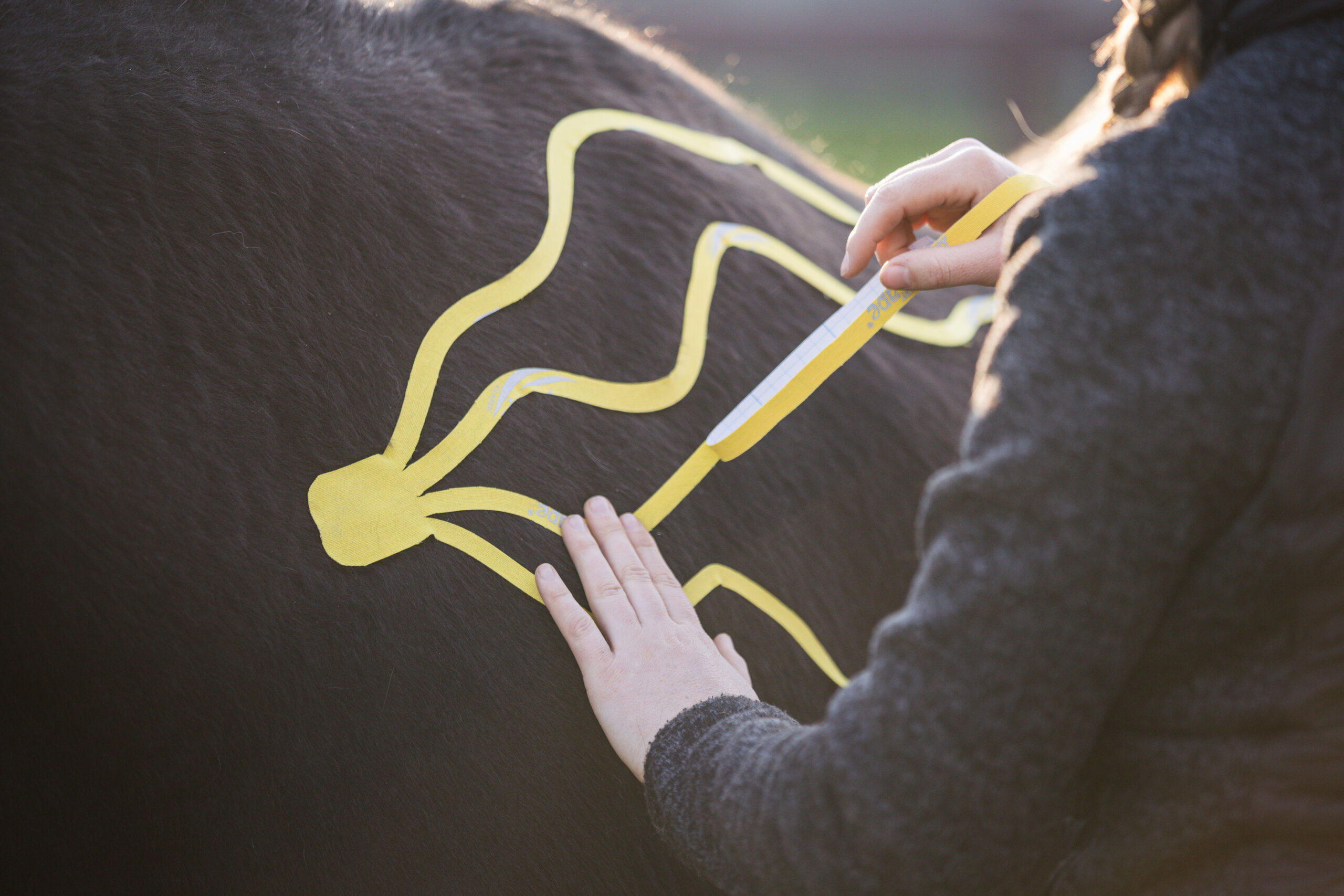 Das kinesiologische Taping ist eine wertvolle Ergänzung zur Therapie. Je nach Anlagetechnik, kann es die Muskulatur gezielt anregen, beispielsweise bei Muskelschwund, oder die Muskulatur bei Verhärtungen entspannen. Zudem kann es auch mit stabilisierender Wirkung für Gelenke und Bänder angelegt werden, ohne dabei die Bewegungsfreiheit einzuschränken. Durch die sanfte Anhebung der Haut fördert das Tape die Durchblutung und wirkt schmerzlindern. Somit ist es eine effektive Ergänzung zur Therapie und trägt zur schnelleren Regeneration Deines Tieres bei.